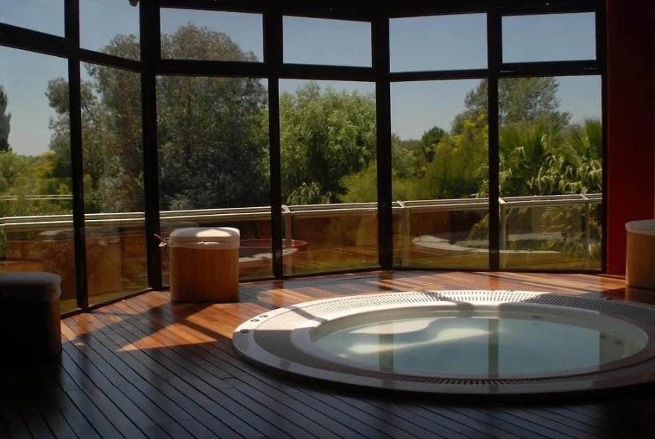 El sector de bienestar de Aguará incluye jacuzzi, ducha escocesa, sauna seco, área de masajes, vestuarios y un espacio de relax, además de un pequeño gimnasio y solárium. Es un spa pensado a escala humana: íntimo, cercano, perfecto para una escapada de parejas o un grupo reducido de amigos.