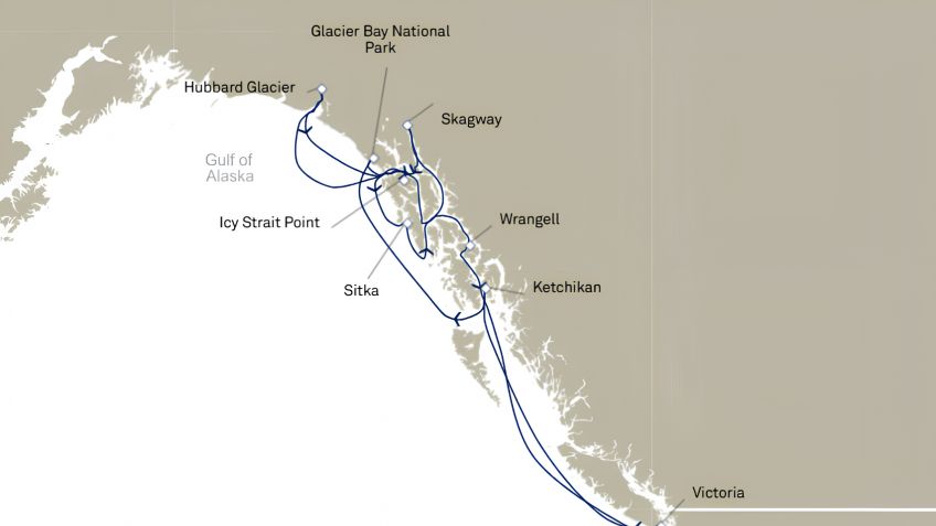 El itinerario parte desde Seattle y recorre íconos del Inside Passage: Ketchikan, Skagway, Icy Strait Point, Sitka, Wrangell, Glacier Bay National Park y Hubbard Glacier, antes de tocar Victoria y regresar a Seattle.